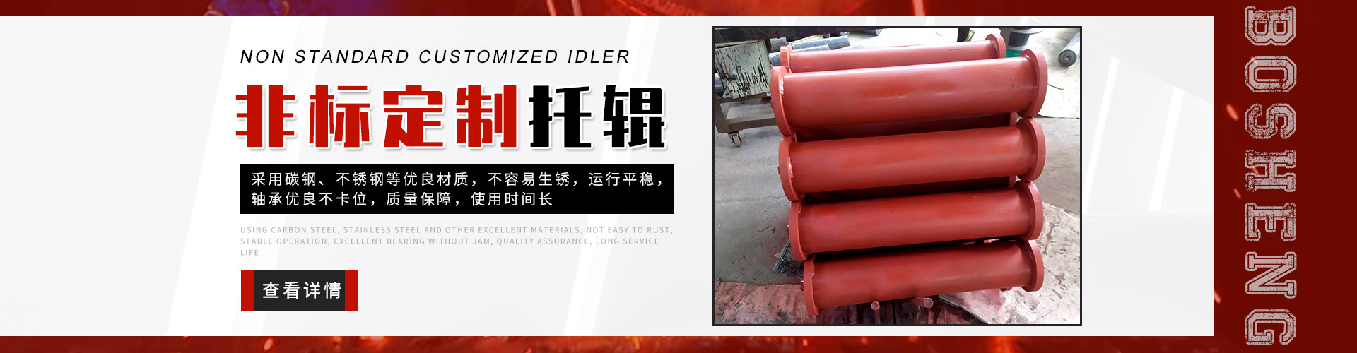 泰安博晟礦山機械有限公司位于山東泰安新泰市汶南鎮(zhèn)陳糧村。緊鄰京滬、京福、萊新高速公路。公路交通極為方便,環(huán)境優(yōu)美。公司主要生產(chǎn):托輥、托輥配件、托輥支架等皮帶輸送機配件。歡迎各界商友前來洽談考察。聯(lián)系電話:13954880316. 泰安博晟礦山機械有限公司采用國際標(biāo)準設(shè)計、制造技術(shù),將托輥的設(shè)計和制造提高到了一個更高的水平,生產(chǎn)的托輥具有小的旋轉(zhuǎn)阻力,長的壽命,小的維修工作量和高的承載能力。鋼管采用托輥專用高頻焊管,管內(nèi)做去刺處理,圓度控制在特殊的公差范圍之內(nèi)。軸是按標(biāo)準公差加工的冷拉鋼制造。軸承座采用進口冷扎鋼板經(jīng)多次工藝沖壓而成。托輥管和軸承座被自動焊接機械手焊接在一起,形成一個具有很高強度的整體構(gòu)造。托輥軸承采用國內(nèi)外知名品牌的大游隙深溝球雙密封軸承,使托輥具有理想的靜平衡和動平衡,其旋轉(zhuǎn)阻力優(yōu)于國標(biāo)。托輥密封采用綜合國外和國內(nèi)迷宮式密封的特點進行了專門設(shè)計,內(nèi)充耐高速高溫和超低溫抗氧化鋰基酯,有效防止雜質(zhì)、水、空氣對托輥內(nèi)部的侵蝕。 目前我們托輥系列產(chǎn)品有槽形上調(diào)心托輥組、槽形托輥、槽形下調(diào)心托輥組、承載托輥、緩沖托輥、回程托輥組、螺旋托輥、摩擦上調(diào)心托輥組、平行緩沖托輥組、平行上調(diào)心托輥、礦用托輥、煤礦專用托輥、梳型托輥、樹脂托輥、陶瓷托輥、橡膠托輥、錐形托輥、立輥等。規(guī)格:直徑50-219mm;長度190-2600mm。 泰安博晟礦山機械有限公司竭誠愿與廣大客戶合作,共同發(fā)展開發(fā)新技術(shù)新項目。泰安博晟礦山機械有限公司秉承